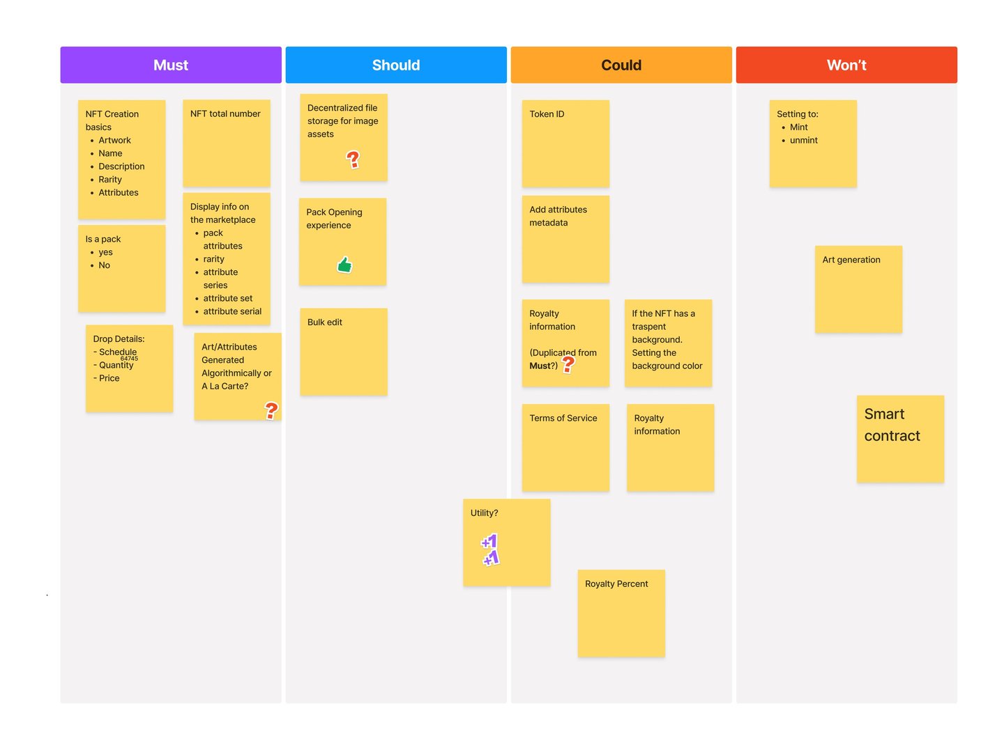 The first challenge to unpack is the performing a workshop and running exercises like a MoSCoW (Must, Should, Could, Won't) to understand what is most important to creation and dropping of NFT and Web3.