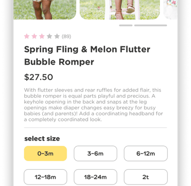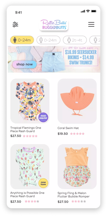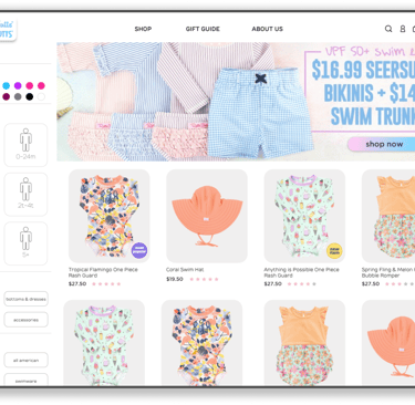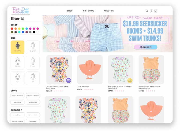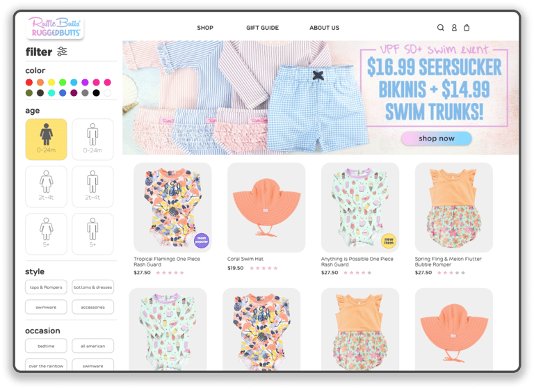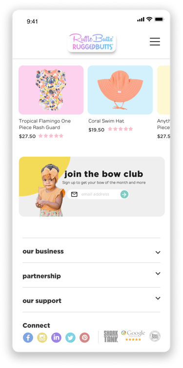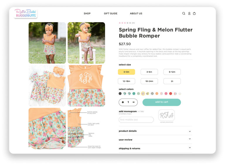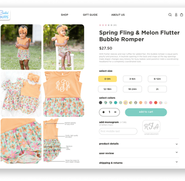Showcase a clean and modern look with a gender neutral color pallet. All the while telling the users that Rufflebutts soft and gentle clothing match their consumer experience.