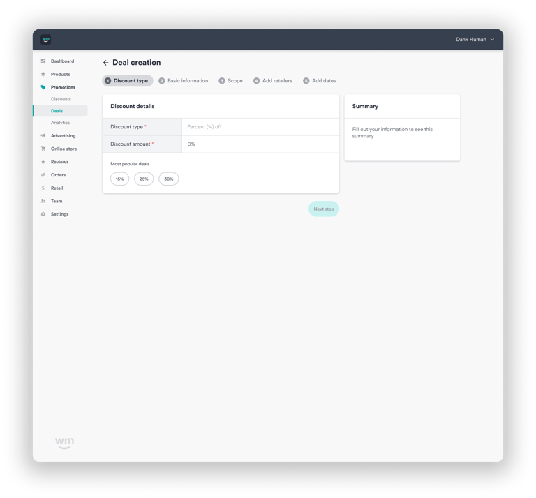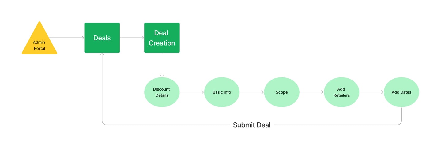 After several rounds of workshoping and research we determined a step-by-step approach would be the best user-centered solution. Each step of this process will allow a brand to enter the information around a deal.